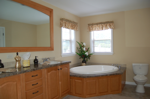 MASTER BATH SHOWING DOUBLE VANITY, PLATFORM TUB, AND FRAMED MIRROR